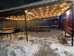 Первый этаж отдых мангальная зона с навесом от дождя и снега музыка танцы и конечно очень жаркая русская баня на дровах