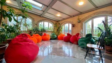 2 этаж: -балкон с видом на каминный зал -спальня ( 2 двуспальные кровати) -спальня ( двуспальная кровать+полуторная кровать+ТВ) -спальня ( двуспальная кровать+диван раскладной) -с/у +ванна+душевая -зимний сад с теннисом и кальянной зоной