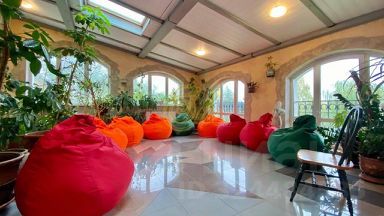 2 этаж: -балкон с видом на каминный зал -спальня ( 2 двуспальные кровати) -спальня ( двуспальная кровать+полуторная кровать+ТВ) -спальня ( двуспальная кровать+диван раскладной) -с/у +ванна+душевая -зимний сад с теннисом и кальянной зоной