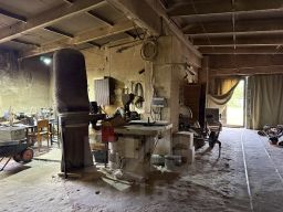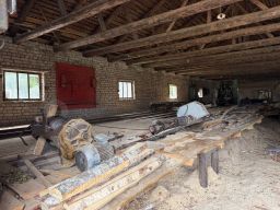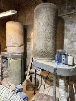 Участок огорожен забором, есть свой пожарный водоем. Запас древесины. Запасные части для станков. Бочка для сжигания отходов и др.
