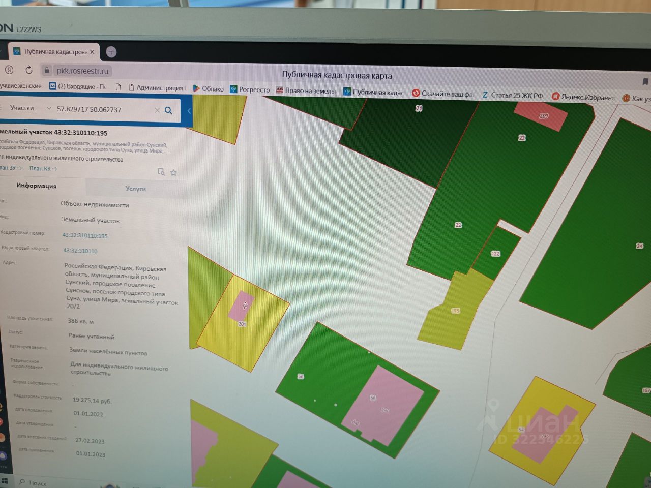 Земельный участок с кадастровым номером 43:32:310110:195, адрес: Российская Федерация, Кировская область, Сунский муниципальный район, Сунское городское поселение, пгт Суна, ул. Мира, з/у 20/2, площадь 386 кв.м., категория - земли населенных пунктов, разрешенное использование - индивидуальное жилищное строительство