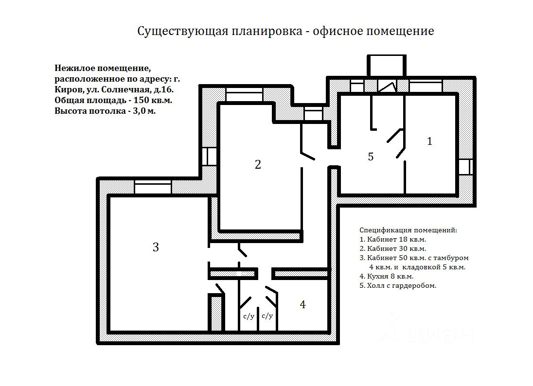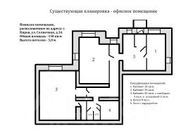 Основные помещения: кабинеты 50, 30, 18 кв.м., кухня 8 кв.м., два санузла, предусмотрены зоны под гардероб, рецепцию, зоны ожидания клиентов, кулер и т.п.