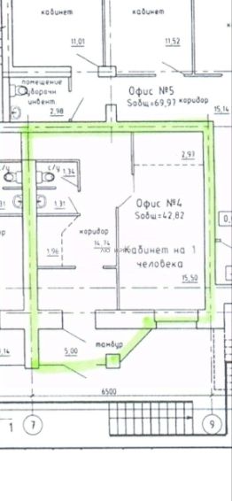 Офис 42м имеет отдельный вход со двора дома, по планировке- зал 20м+ входная группа+ санузел+ вспомогательное помещение 6м.