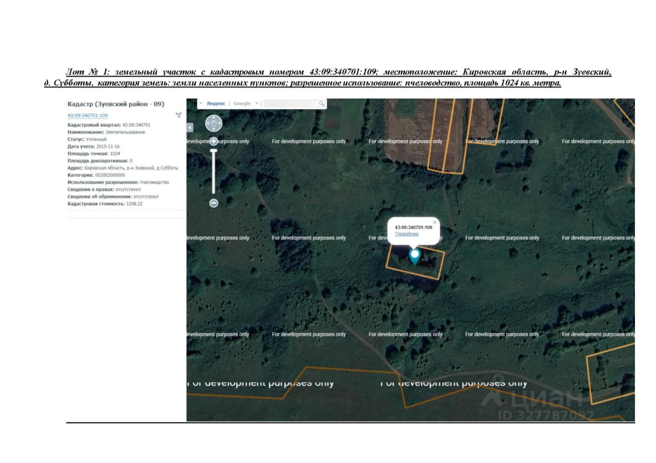 Земельный участок с кадастровым номером 43:09:340701:109; местоположение: Кировская область, р-н Зуевский, д. Субботы, категория земель: земли населенных пунктов; разрешенное использование: пчеловодство, площадь 1024 кв. метра