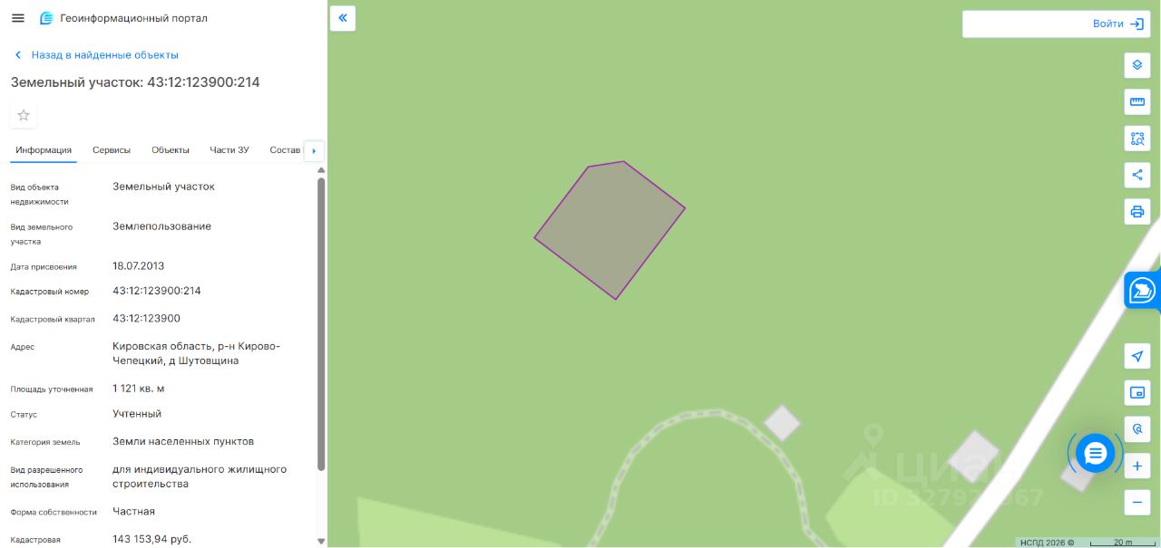 Земельный участок площадью 1121 кв. м, кадастровый номер 43:12:123900:214, категория земель: земли населенных пунктов, виды разрешенного использования: для индивидуального жилищного строительства. Местонахождение: Кировская обл., Кирово-Чепецкий район, д. Шутовщина. Вид права собственность. Обременение аресты, ограничения прав на земельный участок, предусмотренные статьей 56 Земельного кодекса РФ. Собственник Маркунина Я.В. (уведомление 541 от 24.02.2026).