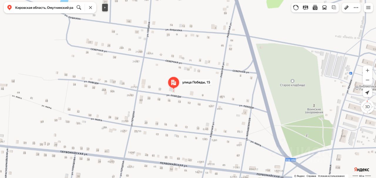 Жилое здание "жилой дом" площадью 33,6 кв.м, кадастровый номер 43:22:350301:208, расположенное по адресу: Кировская область, Омутнинский район, пгт. Песковка, ул. Победы, д. 15. Количество этажей 1, в том числе подземных 0. Объект недвижимости расположен в границах земельного участка с кадастровым номером 43:22:350304:35, право государственной собственности в отношении которого не разграничено, арендные отношения оформлены. Вид права общая долевая собственность. Обременение аресты. Собственник Дураков С.Н. (уведомление 594 от 27.02.2026).