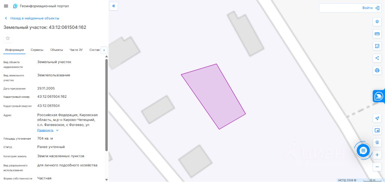 Земельный участок площадью 704 кв. м, кадастровый номер 43:12:061504:162, категория земель: земли населенных пунктов, виды разрешенного использования: для личного подсобного хозяйства. Местонахождение: Кировская обл., Кирово-Чепецкий р-н, Фатеевское с.п., с. Фатеево, ул. Заречная, зу 27/2. Вид права собственность. Обременение аресты. Собственник Симонов А.О. (уведомление 53-ГМУ от 10.03.2026).