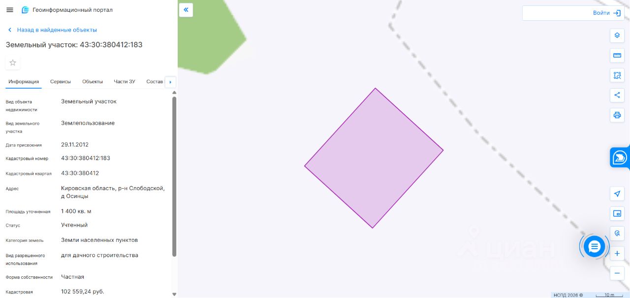 Земельный участок площадью 1400 кв. м, кадастровый номер 43:30:380412:183, категория земель: земли населенных пунктов, виды разрешенного использования: для дачного строительства. Местонахождение: Кировская обл., Слободской район, д. Осинцы. Вид права собственность. Обременение аресты, обременение в виде залога (ипотеки) в пользу Моховой Е.Г. (сумма ипотеки в отношении земельного участка составляет 100 000,00 руб.); обременение в виде ипотеки УФНС по Кировской области (решение о принятии обеспечительных мер 84 от 06.06.2025, решение о принятии обеспечительных мер 83 от 06.06.2025). Собственник Спицына Е.А. (уведомление 61-ГМУ от 12.03.2026).