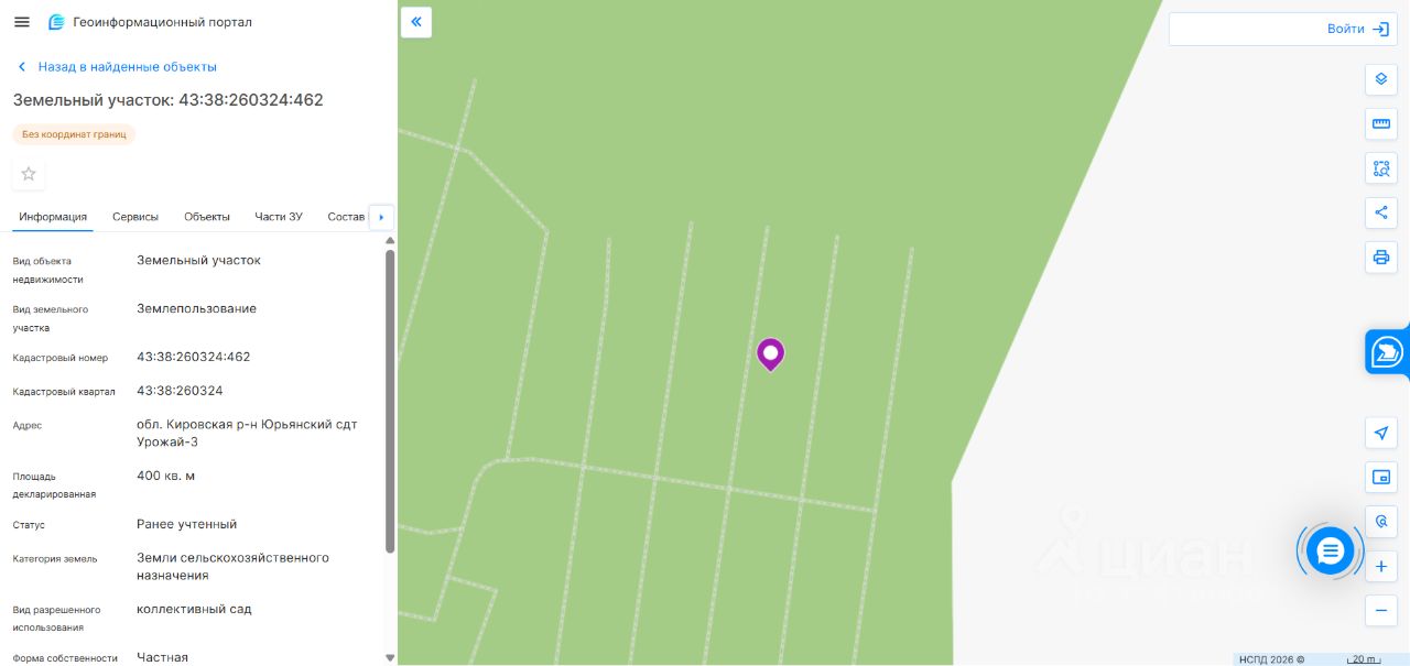 Земельный участок площадью 400 кв. м, кадастровый номер 43:38:260324:462, категория земель: земли сельскохозяйственного назначения, виды разрешенного использования: коллективный сад. Местонахождение: Кировская обл., Юрьянский район, сдт Урожай-3. На земельном участке постройка в виде садового домика, примерной площадью 12 кв. м., стены деревянные, крыша покрыта резиновым шифером, фундамент; ленточный. Вид права собственность. Обременение аресты, граница земельного участка не установлена в соответствии с требованиями земельного законодательства (требуется уточнение). Собственник Пестов И.В. (уведомление 622 от 04.03.2026).