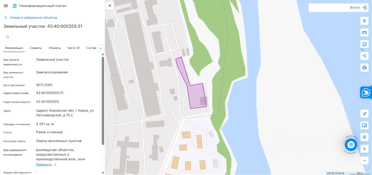 Земельный участок площадью 3251 кв. м, кадастровый номер 43:40:000355:31, категория земель: земли населенных пунктов, виды разрешенного использования: размещение объектов, предусмотренных в производственной зоне, зоне инженерной и транспортной инфраструктур. Местонахождение: Кировская обл., г. Киров, ул. Лесозаводская, д. 10а. Вид права собственность. Обременение аресты. Собственник ООО "АРТ-СТРОЙ" ИНН 4345293884 (уведомление 77-ГМУ от 18.03.2026).