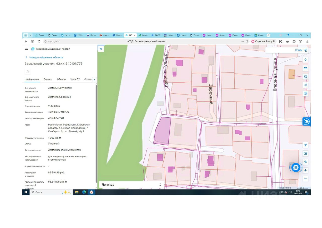 Земельный участок с кадастровым номером 43:44:340101:776 площадь 1300 по адресу Российская Федерация, Кировская область, г.о. город Слободской, г. Слободской, пер Летний, з/у 1