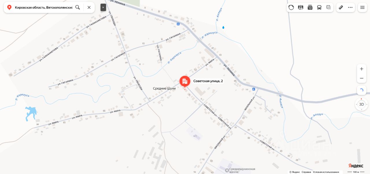 Нежилое помещение площадью 406,4 кв.м., кадастровый номер 43:07:100403:621, расположенное по адресу: Кировская область, Вятскополянский район, д. Средние Шуни, ул. Советская, д. 2. Вид права собственность. Обременение аресты, обременение в виде ипотеки в пользу МИФНС 21 по Пермскому краю. Собственник ООО "Гринсити" ИНН 5905053008 (уведомление 11т-ГМУ от 20.03.2026).