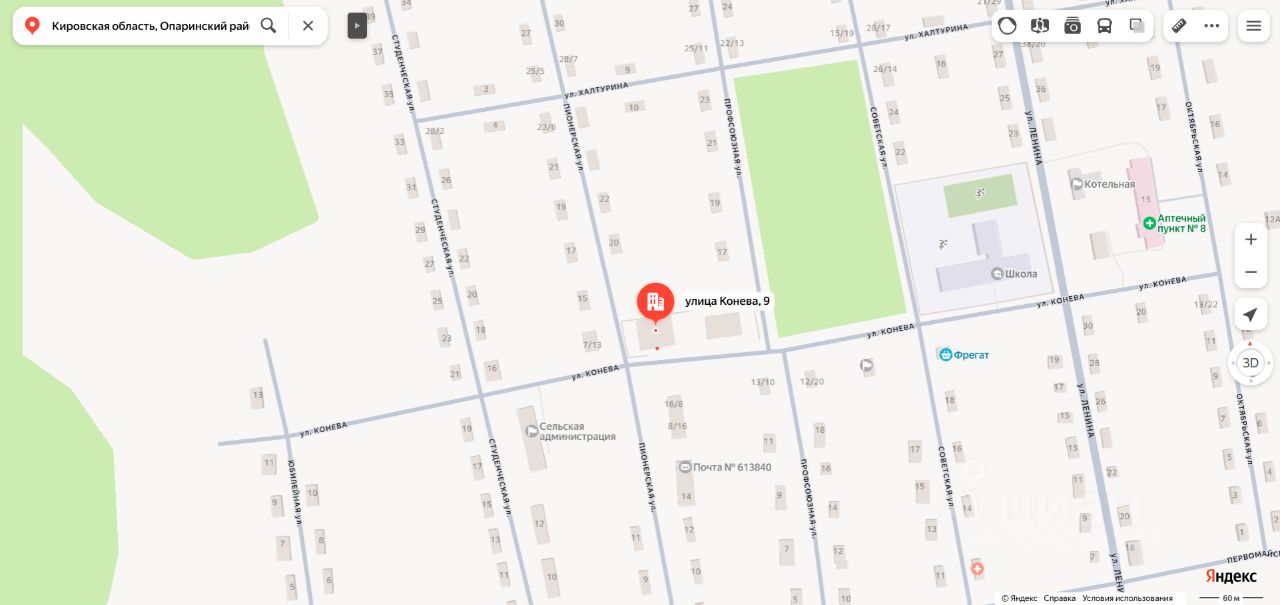 Нежилое здание "здание магазина" площадью 673,8 кв.м., кадастровый номер 43:23:320106:94, расположенное по адресу: Кировская область, Опаринский район, п. Маромица, ул. Конева, д. 9. Количество этажей 1, в том числе подземных 0. Объект недвижимости расположен в границах земельного участка с кадастровым номером 43:23:320104:19, право государственной собственности в отношении которого не разграничено. В отношении земельного участка оформлены арендные отношения. Вид права собственность. Обременение: аресты. Собственник ООО "Меркурий" ИНН 4323002757 (уведомление 881 от 26.03.2026).