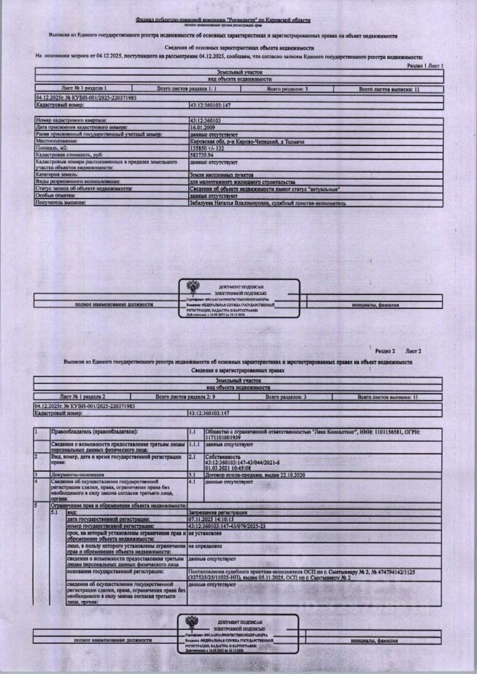 (229-98011-24) Земельный участок площадью 135850 кв.м., категория земель: земли населенных пунктов, вид разрешенного использования: для малоэтажного жилищного строительства, расположенного по адресу: Кировская область, р-н Кирово-Чепецкий, д. Толмачи, кадастровый номер: 43:12:360103:147, вид права: собственность. На земельном участке строения не установлены. Должник ООО "ЛЕКС КОНСАЛТИНГ". Начальная цена: 2 151 860 рублей. Обременение: арест.