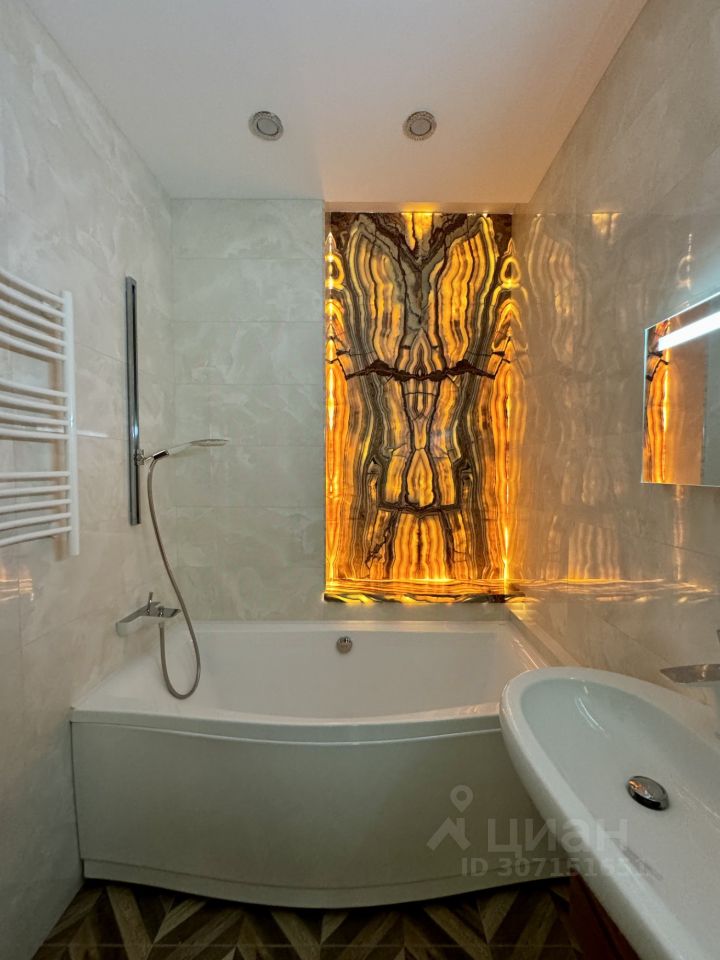 Ванная комната оснащена: душевой с тропическим душем, ванной. При отделке стен использовался натуральный оникс с подсветкой. Установлены приборы учёта. Новые трубы и европейская сантехника. Установлен подвесной унитаз с гигиеническим душем.