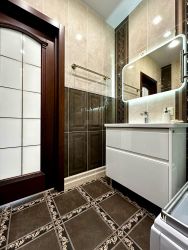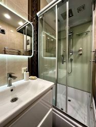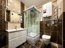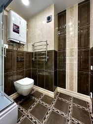 Санузел выложен керамогранитом марки "Kerama Marazzi". Установлены приборы учёта. Новые трубы и немецкая сантехника. Установлено зеркало с сенсорным включением подсветки. Установлен подвесной унитаз с инсталляцией и водонагреватель. Есть выводы под стиральную машинку.