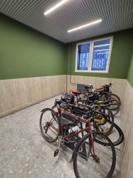 Закрытый двор с детской площадкой, сквозные подъезды; колясочные для хранения велосипедов, колясок и тюбингов.