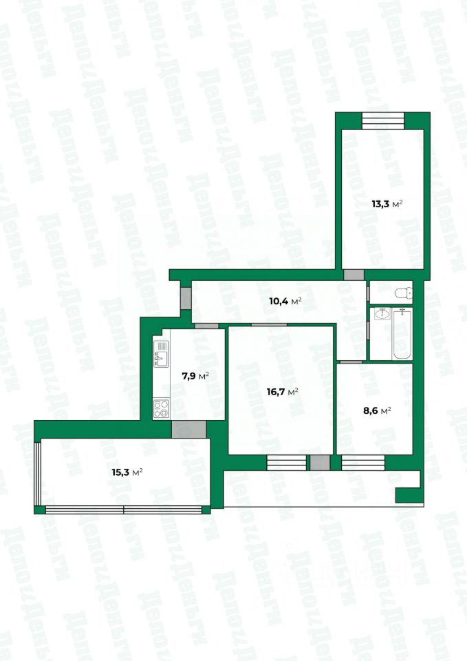 - жилые комнаты площадью 16,7 и 13,3 и 8,6 кв.м.