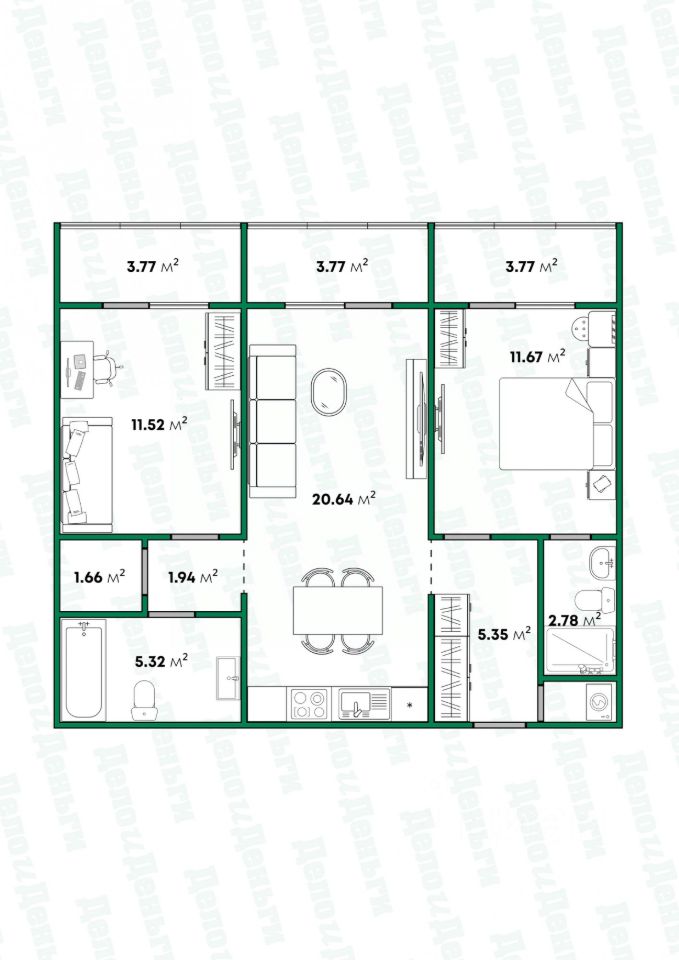 - жилые комнаты площадью 11,6; 11,5 кв.м.