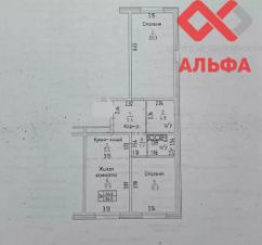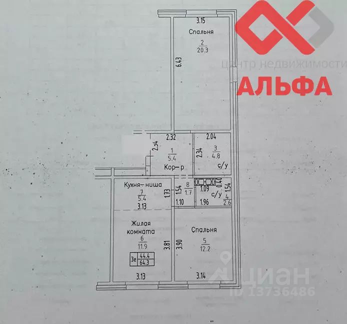 Общая площадь квартиры 64,3 кв.м. Кухня 12 кв.м., комната 20,3 кв.м., спальная 12,2 кв.м.