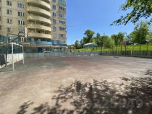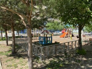 Придомовая территория с видеонаблюдением, современная детская площадка вокруг которой растут сосны, футбольно-баскетбольная площадка