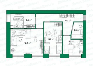 - Три изолированные комнаты 18,3 кв.м, 13,2 кв.м и 8,4 кв.м правильной формы обеспечивают комфорт и приватность;