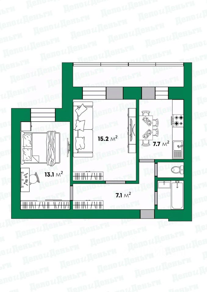 - жилые комнаты площадью 15,2 и 13,1 кв.м.