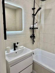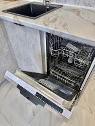 Квартира почти полностью меблирована. Кухня, прихожая, большая комната, ванная комната и туалет обставлены стильной мебелью. Новая техника: холодильник, электрическая варочная поверхность, духовой шкаф, посудомоечная машина, вытяжка, стиральная машина. Все входит в стоимость квартиры. Вторая комната будет ждать воплощения дизайнерских решений будущих собственников.