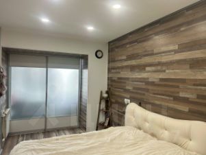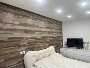 В спальне есть вместительная гардеробная, стены обшиты ламинатом.
