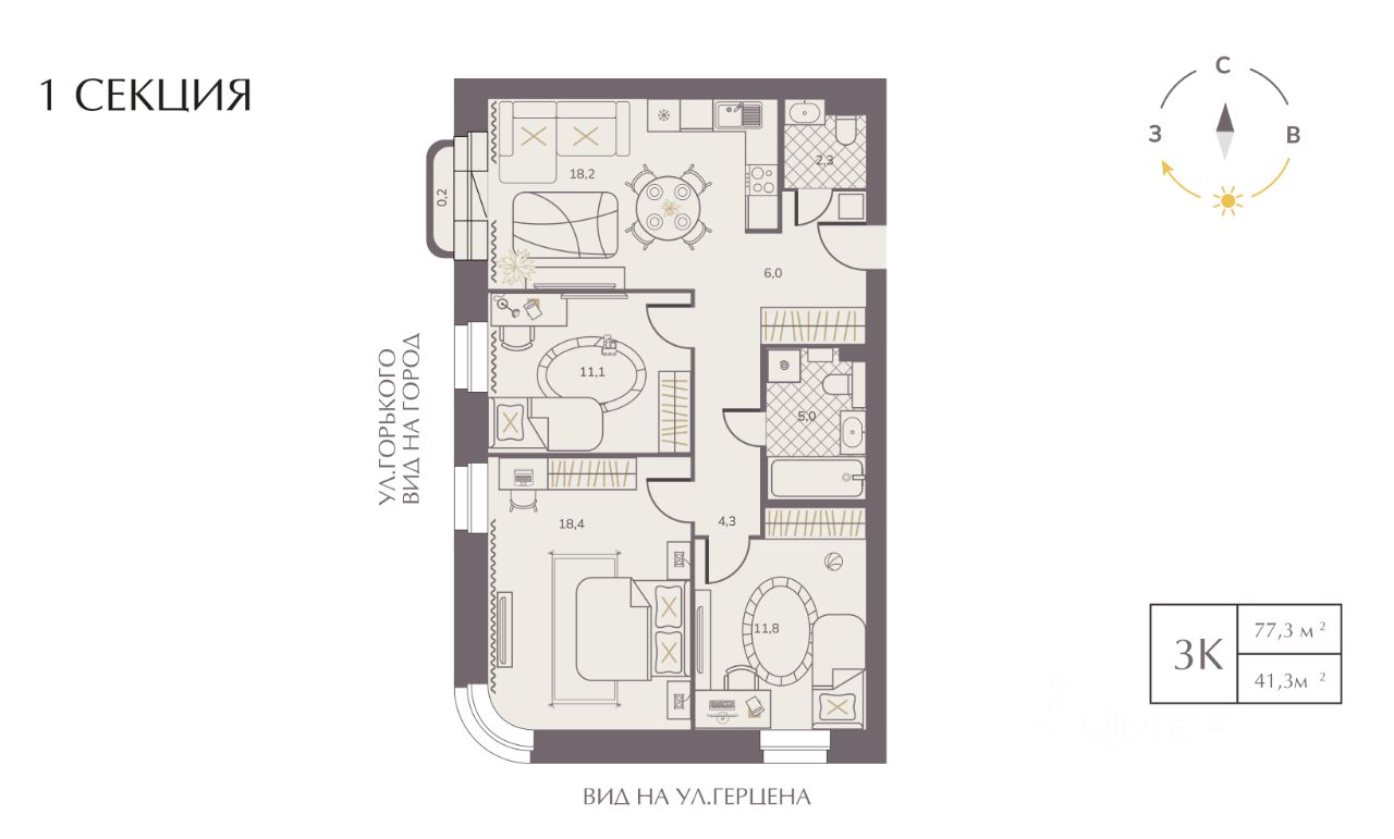Видовые квартиры на парк с панорамными окнами и потолками высотой до 3,2 метра. Окна на восток и запад — для красивых закатов и рассветов.