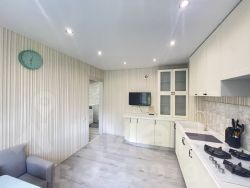 ** Общая площадь: 70,4 кв.м. и плюс лоджия: 4 кв.м., комнаты: 17 кв.м., 12 кв.м. и 11 кв.м. (изолированы), большая кухня: 12,6 кв.м. Санузел раздельный. Лоджия (остекление пластиковый стеклопакет). Окна (ПВХ) выходят на разные стороны дома (дополнительное проветривание и освещение). Большая прихожая: 12,3 кв.м. В квартире выполнен косметический ремонт: натяжные потолки, пол - ламинат. Установлены новые межкомнатные и входная двери. Кухня оборудована новым гарнитуром.