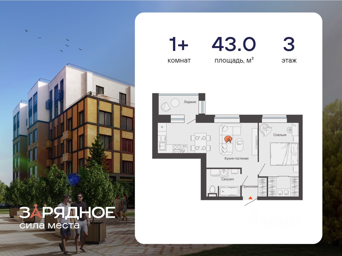 Продается 1-комнатная квартира, корпус 4/2, площадь 43.00 кв. Квартира находится в жилом комплексе комфорт-класса "Зарядное" (ГК "Железно").