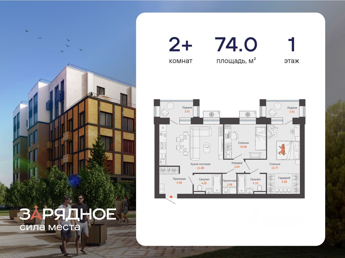 Продается 2-комнатная квартира, корпус 4/1, площадь 74.00 кв. Квартира находится в жилом комплексе комфорт-класса "Зарядное" (ГК "Железно").