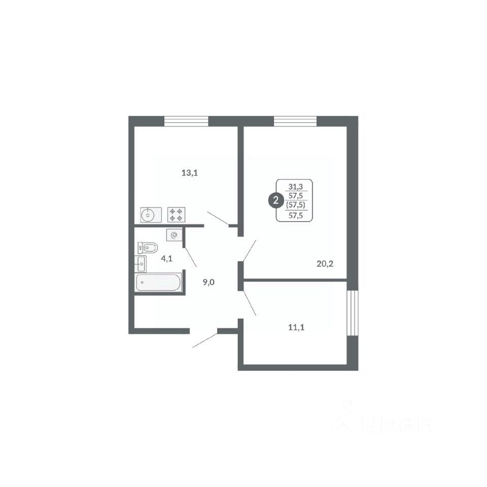 Общая площадь57,5 м²