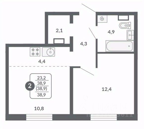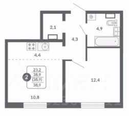 ---ЕВРО-2 комн. квартира 38,9 м2 . Комната 12,4 м2 + кухня - гостиная 16 м2, гардеробная 2,1 м2, санузел 4,9 м2.