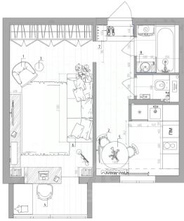 Планирoвка квартиpы: кухня - 7,9 м2, спальня - 16,9 м2 с выходом на лоджию, санузел раздельный, прихожая - 4,0 м2.