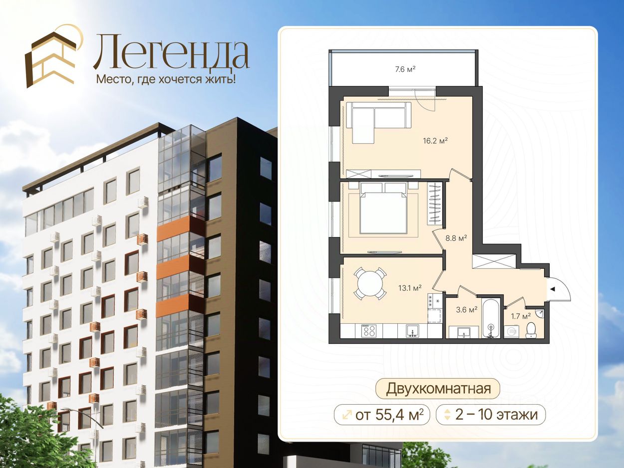 Пpoдаeтcя двухкомнатная квартира площадью 57,5 кв. м. в строящемся доме в районе центрального рынка. Квapтиpа наxoдитcя в жилoм комплексе комфорт-клaсса "Легенда". В квартире две изолированные комнаты и просторная кухня, раздельный санузел. В спальне и прихожей есть возможность организации мест хранения, гостиная отлично подходит для зонирования. Из гостиной выход на лоджию 7,6 кв.м., которая идеально подойдет для организации рабочего кабинета или лаунж-зоны. ЖК "Легенда" подходит для тех, кто привык жить в одном ритме с городом, одно из ключевых преимуществ — удачное расположение дома: недалеко от центра города, в шаговой доступности парк имени Кирова, торговые центры и кафе, поликлиники и медцентры, школа, детские сады и ВУЗы, остановки общественного транспорта. В доме всего 52 квартиры, закрытая территория, система видеонаблюдения, собственная безопасная детская площадка, наземный и подземный паркинг, есть место для удобного и безопасного хранения колясок, велосипедов и самокатов.
