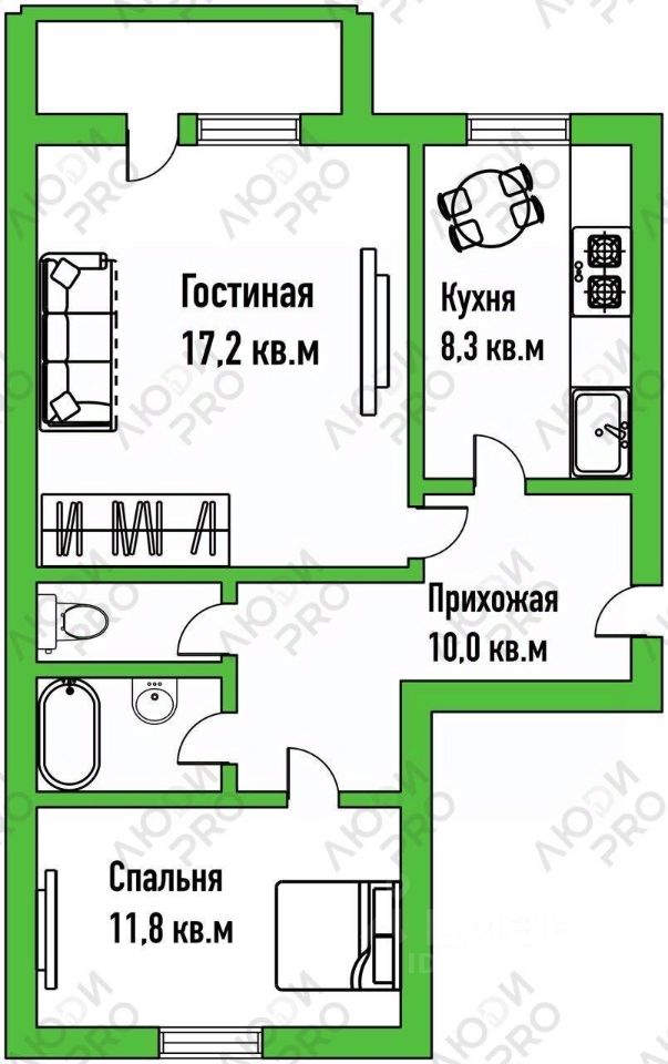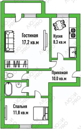 Площадь квартиры 51, 2 кв. м. Комнаты 17. 2 кв. м. и 11. 8 кв. м. , кухня 8. 3 кв. м.