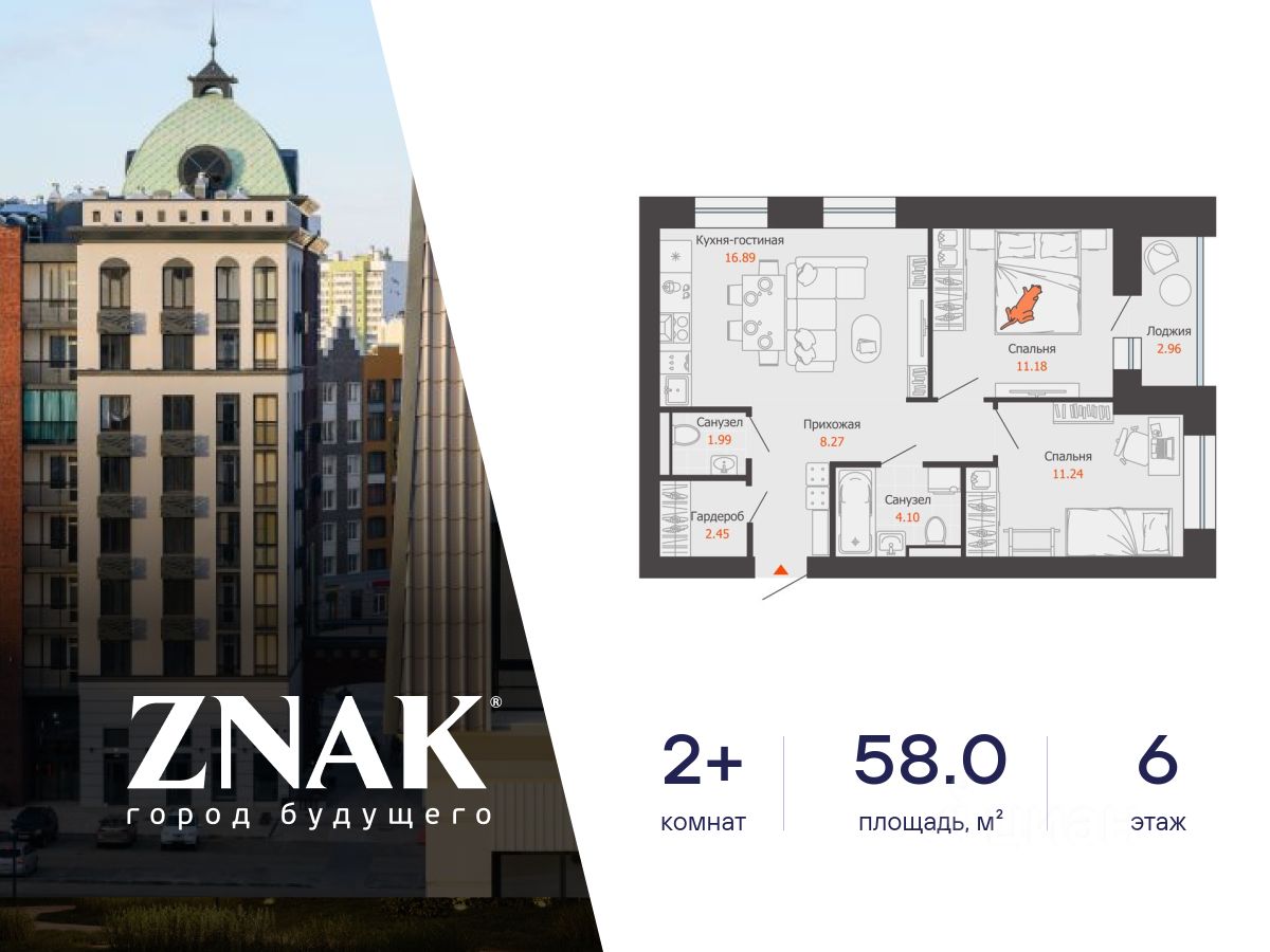Продается 2-комнатная квартира в 3 км от Зубаревского леса, площадью 58.00 кв. м. Квартира находится в жилом комплексе комфорт-класса ZNAK от девелопера "Железно".