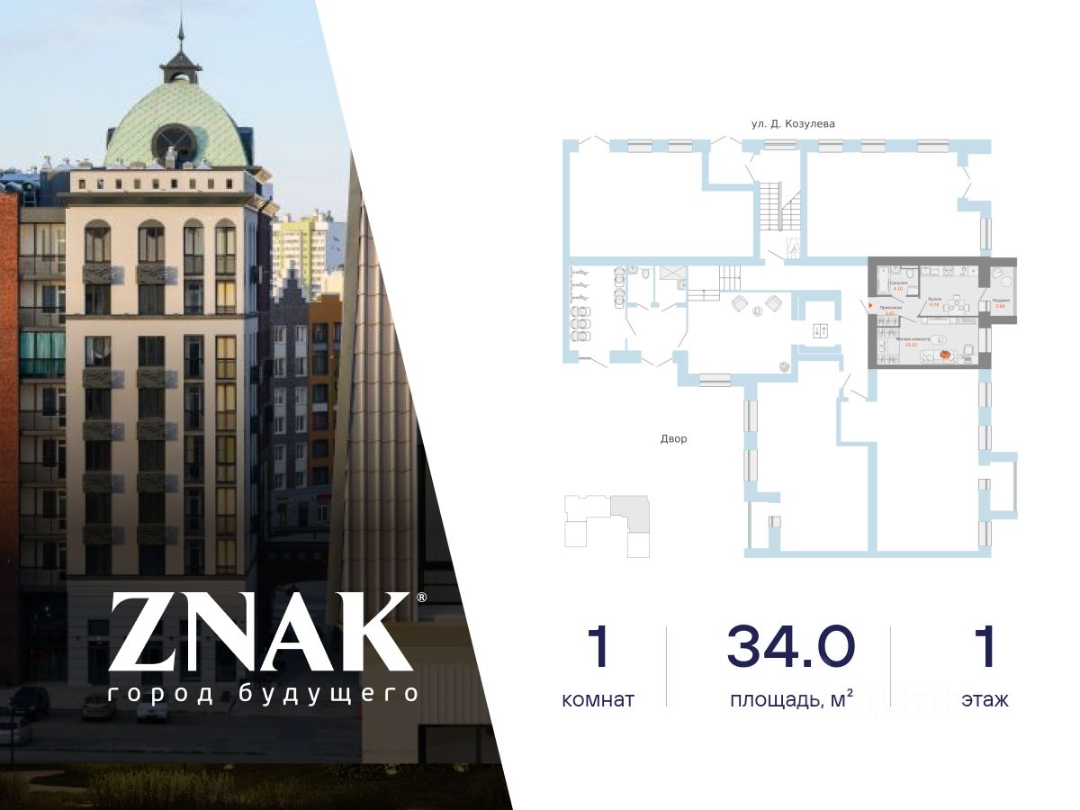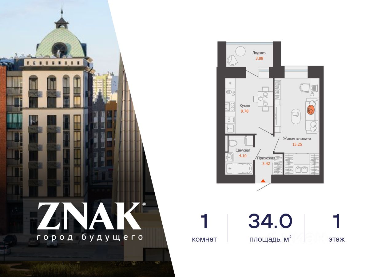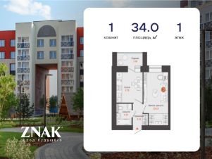 Продается 1-комнатная квартира в 3 км от Зубаревского леса, площадью 34.00 кв. м. Квартира находится в жилом комплексе комфорт-класса ZNAK от девелопера "Железно".