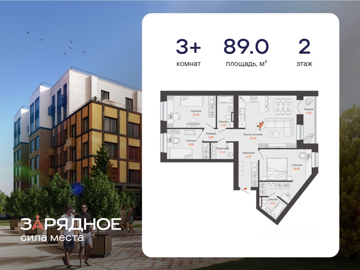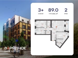 Продается 3-комнатная квартира, корпус 4/2, площадь 89.00 кв. Квартира находится в жилом комплексе комфорт-класса "Зарядное" (ГК "Железно").