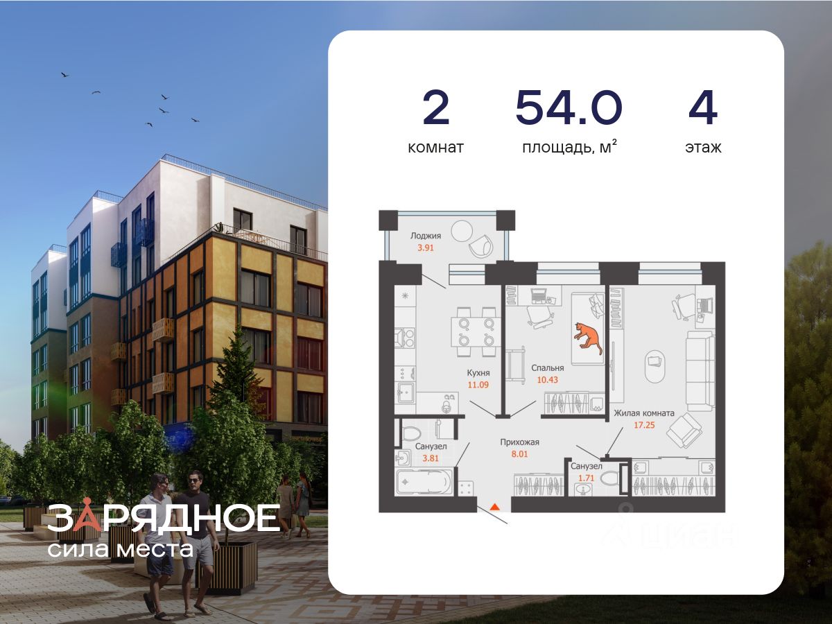 Продается 2-комнатная квартира, корпус 4/2, площадь 54.00 кв. Квартира находится в жилом комплексе комфорт-класса "Зарядное" (ГК "Железно").