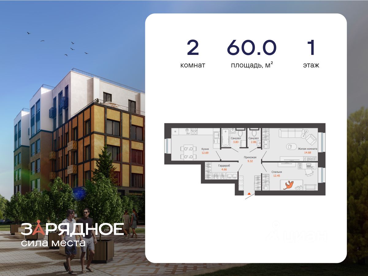 Продается 2-комнатная квартира, корпус 4/2, площадь 60.00 кв. Квартира находится в жилом комплексе комфорт-класса "Зарядное" (ГК "Железно").