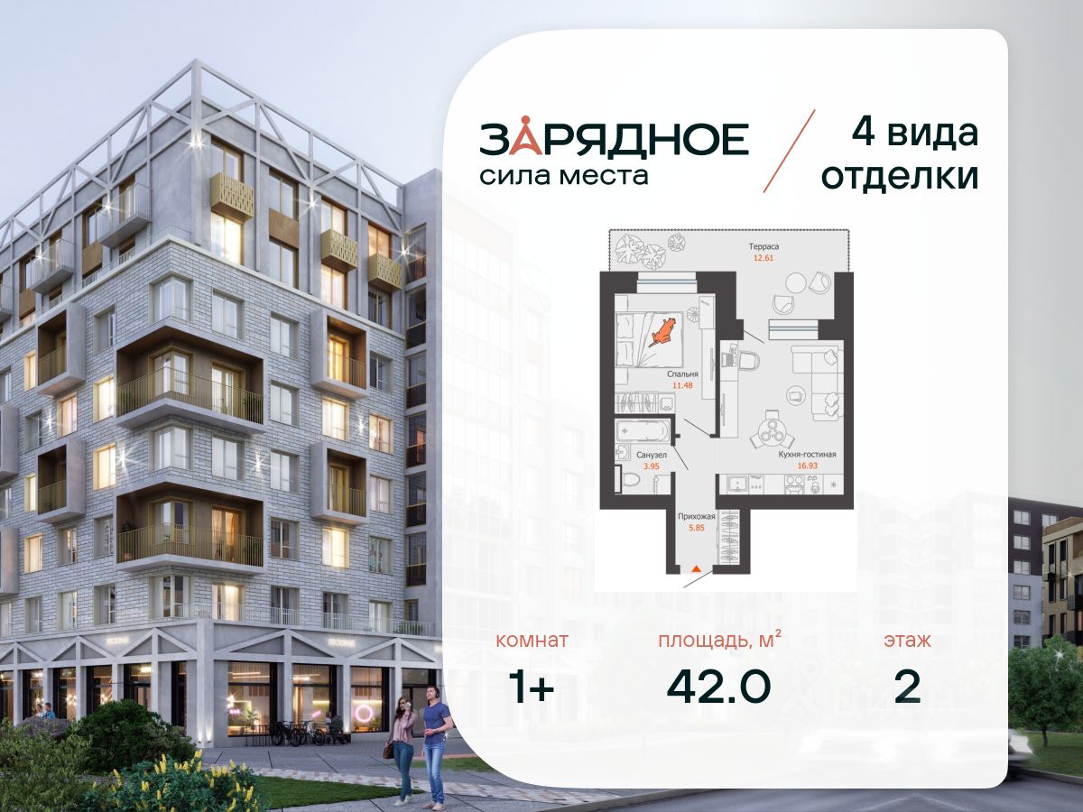 Продается 1-комнатная квартира, корпус 4/2, площадь 42.00 кв. с предчистовой отделкой. Квартира находится в жилом комплексе комфорт-класса "Зарядное" (ГК "Железно").