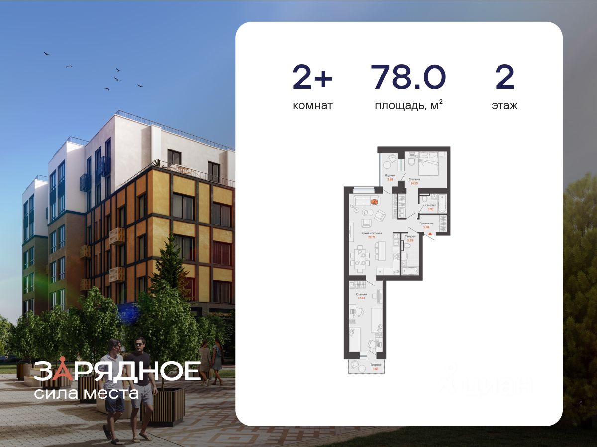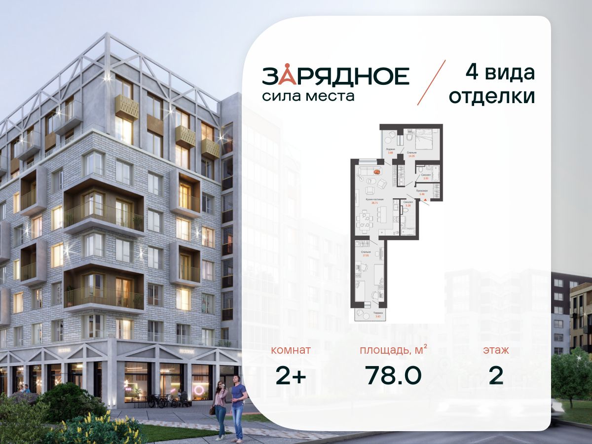Продается 2-комнатная квартира, корпус 4/2, площадь 78.00 кв. Квартира находится в жилом комплексе комфорт-класса "Зарядное" (ГК "Железно").