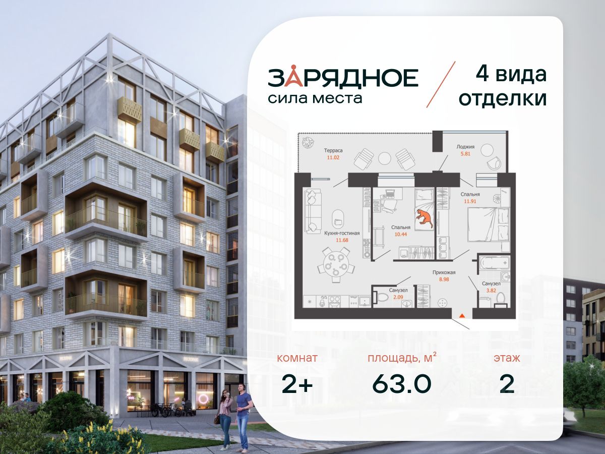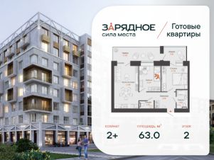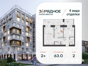 Продается 2-комнатная квартира, корпус 4/2, площадь 63.00 кв. Квартира находится в жилом комплексе комфорт-класса "Зарядное" (ГК "Железно").