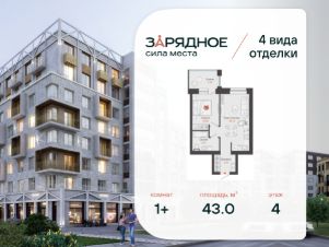 Продается 1-комнатная квартира, корпус 4/2, площадь 43.00 кв. Квартира находится в жилом комплексе комфорт-класса "Зарядное" (ГК "Железно").