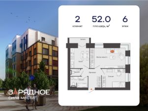 Продается 2-комнатная квартира, корпус 4/2, площадь 52.00 кв. Квартира находится в жилом комплексе комфорт-класса "Зарядное" (ГК "Железно").