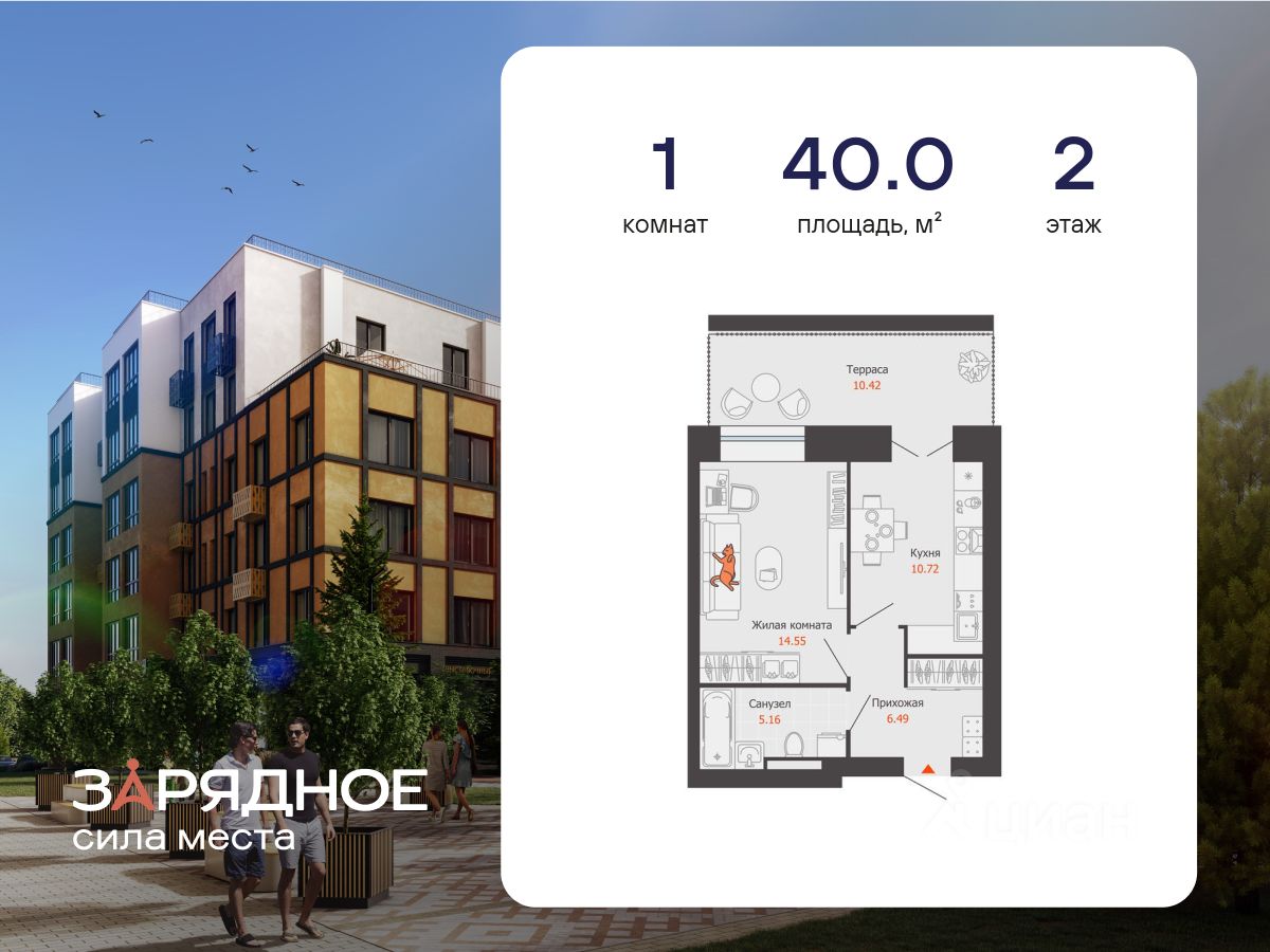 Продается 1-комнатная квартира, корпус 4/1, площадь 40.00 кв. Квартира находится в жилом комплексе комфорт-класса "Зарядное" (ГК "Железно").