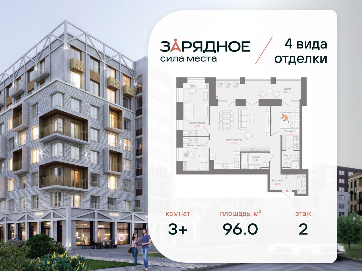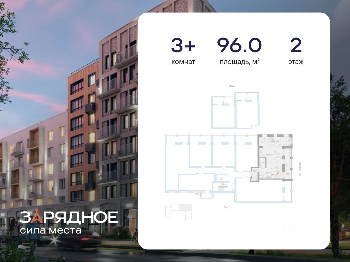 Продается 3-комнатная квартира, корпус 4/1, площадь 96.00 кв. Квартира находится в жилом комплексе комфорт-класса "Зарядное" (ГК "Железно").